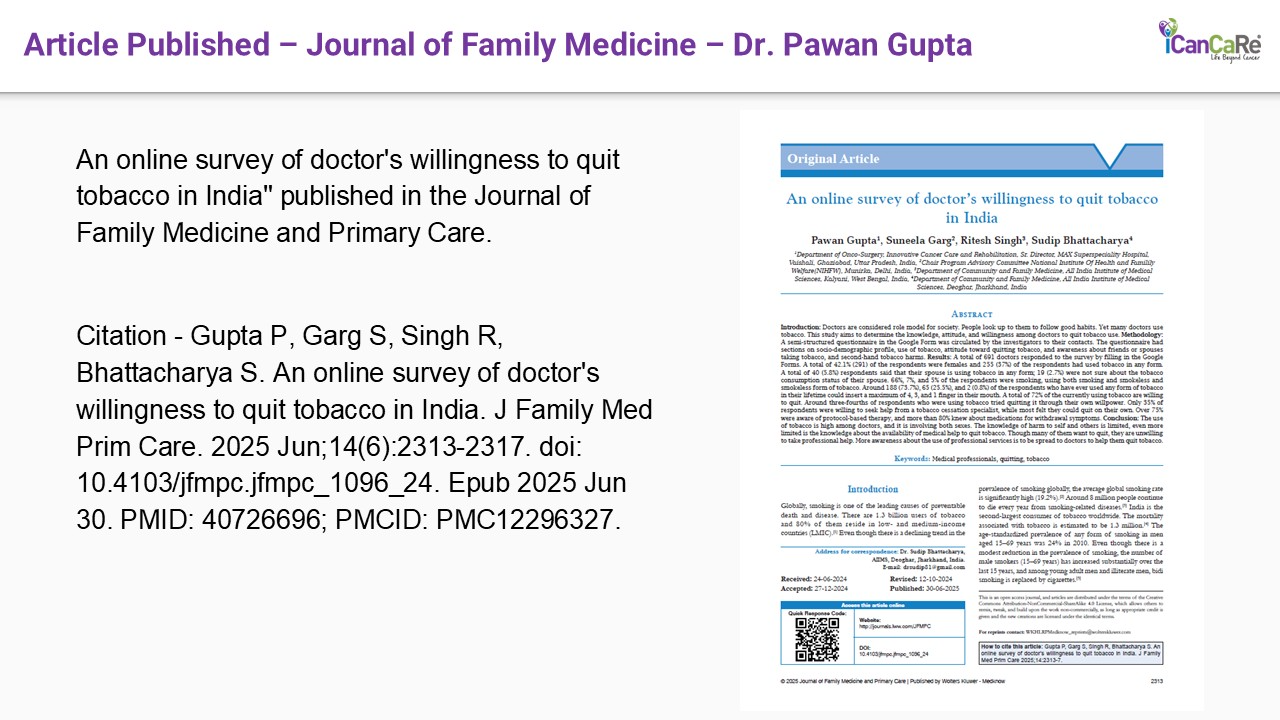 https://pubmed.ncbi.nlm.nih.gov/40726696 Citation – Gupta P, Garg S, Singh R, Bhattacharya S. An online survey of doctor’s willingness to quit tobacco…